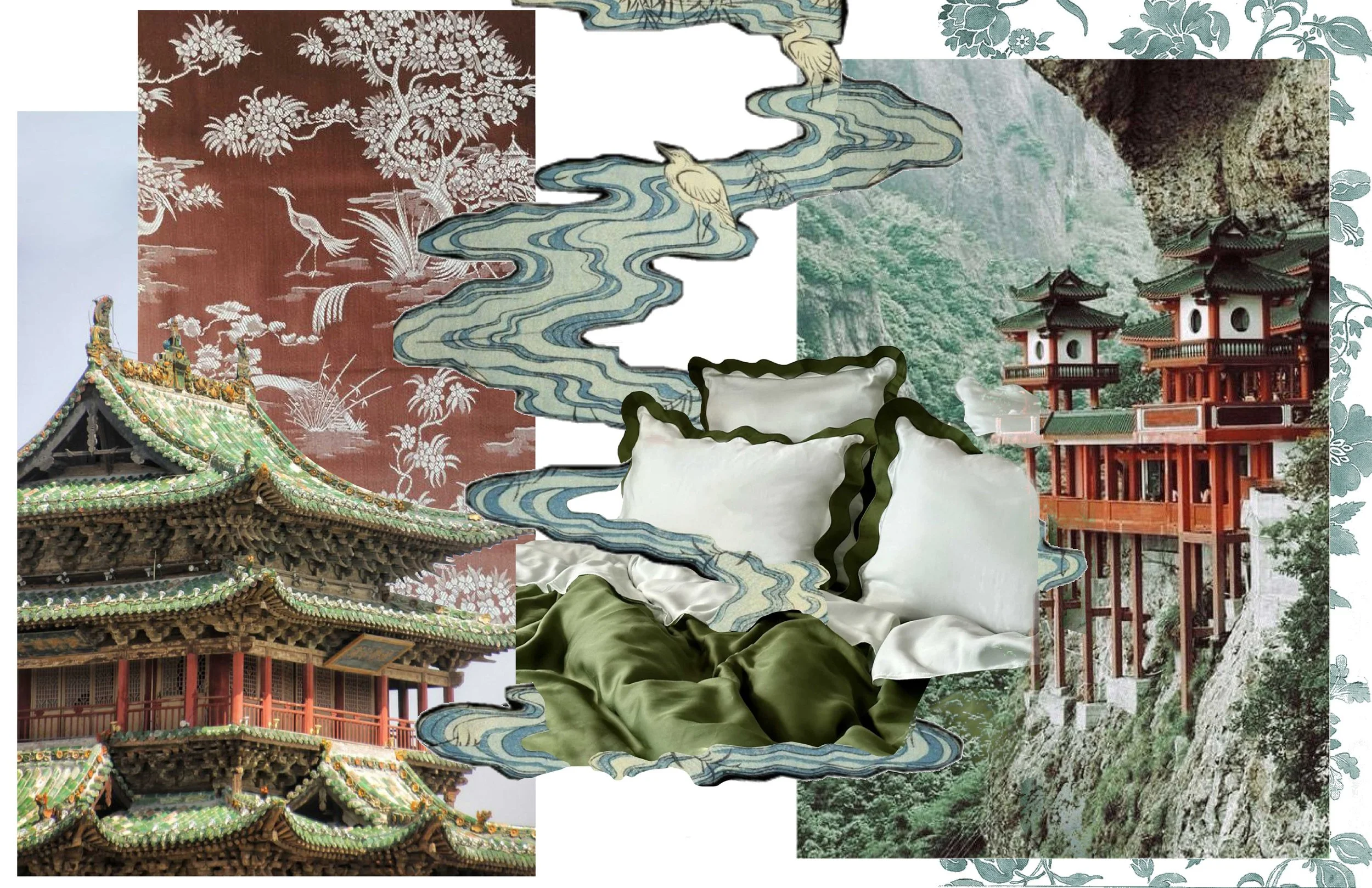 this collection is inspired by the beauty of traditional Chinese landscape art, featuring floral motifs, clouds, and architectural elements